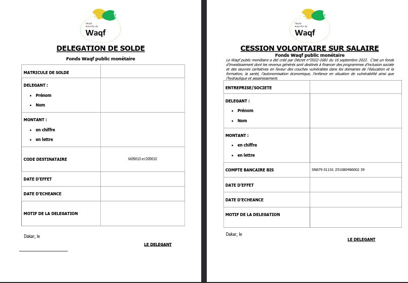 Comment agir ? C’est simple ! Utilisez le formulaire de délégation de solde ci-joint pour programmer votre contribution. Choisissez le montant et les modalités qui vous conviennent. Déposez le formulaire au siège de la Haute Autorité du Waqf (au 4e étage de l’Immeuble Thiargane, situé à la Place OMVS à Dakar, quartier Mermoz), à la Direction de la Solde ou dans les Contrôles régionaux des Finances.